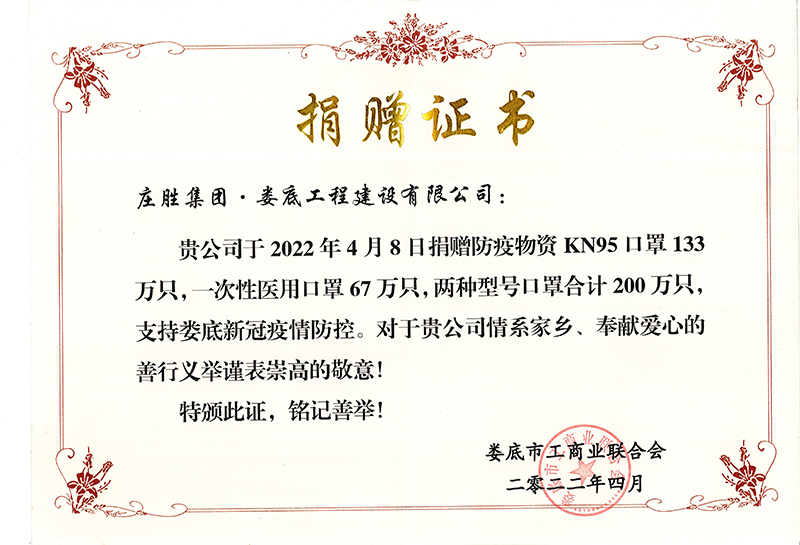 2022年為支持婁底新冠疫情防控捐贈中N95口罩133萬只,一次性醫用口罩67萬只捐贈證書