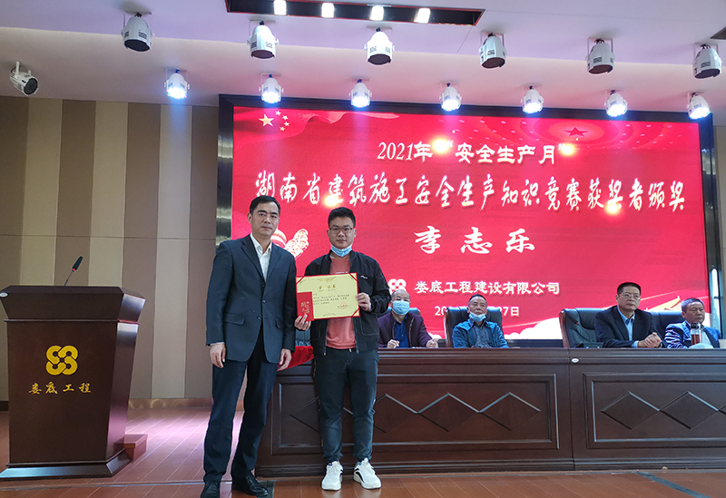 5總工程師李偉(左一)為湖南省建筑施工安全生產(chǎn)知識競賽獲獎?wù)哳C獎