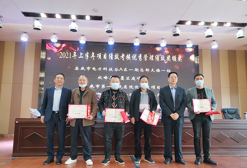 5黨支部書記林有良(右二)、總經(jīng)理助理姜建輝(左一)為績效考核中獲得優(yōu)秀管理績效項目頒獎